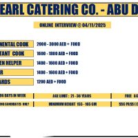 Salary : 2000-3000 AED+ Food( INR – 48,000 – 70,000)