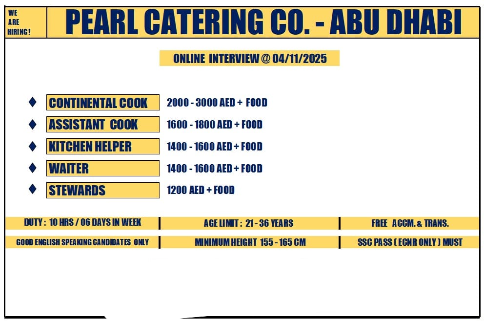 Salary : 1400 – 1600 AED + Food (INR – 33,655 – 38,463)